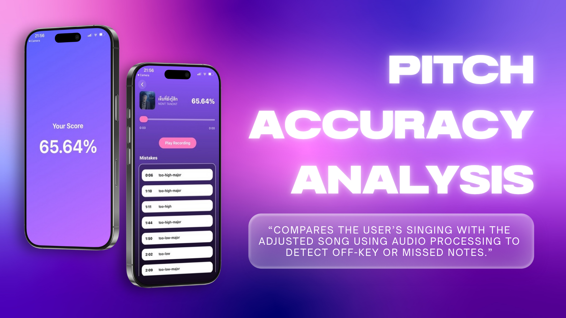 Singo is a mobile singing assistant designed to help users sing more comfortably by personalizing songs to match their vocal range. The app allows users to adjust the key of a song and analyzes their performance after singing. Using advanced audio processing techniques, Singo compares the user’s voice with the modified melody, detects off-key or missed notes, and provides a percentage-based pitch accuracy score. Through personalized insights and easy-to-understand feedback, Singo encourages users to enhance their vocal skills, build confidence, and enjoy singing as both a fun and expressive experience.