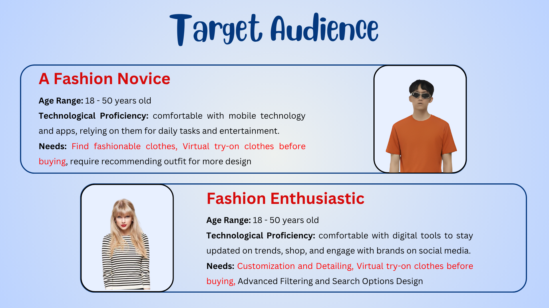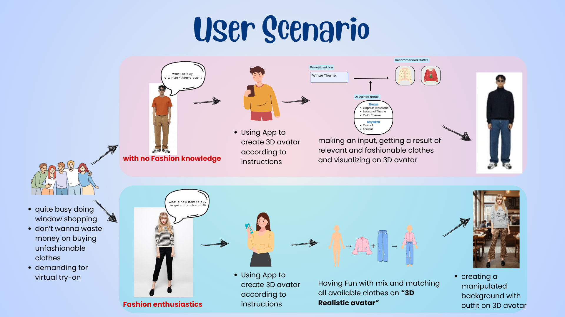 StyleVue is a mobile application designed to revolutionize how consumers engage with online clothing brands. By combining AI-powered avatars, virtual try-on experiences, and wardrobe management, the app enables users to visualize outfits that match their real physique and existing clothes. Targeting major fashion retailers like Zara and H&M, StyleVue enhances shopping experiences, reduces return rates, and provides brands with valuable consumer insights. Through its recommendation system, the platform not only simplifies outfit selection but also aligns users with current fashion trends.