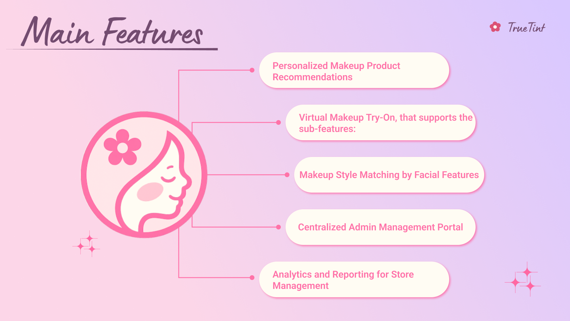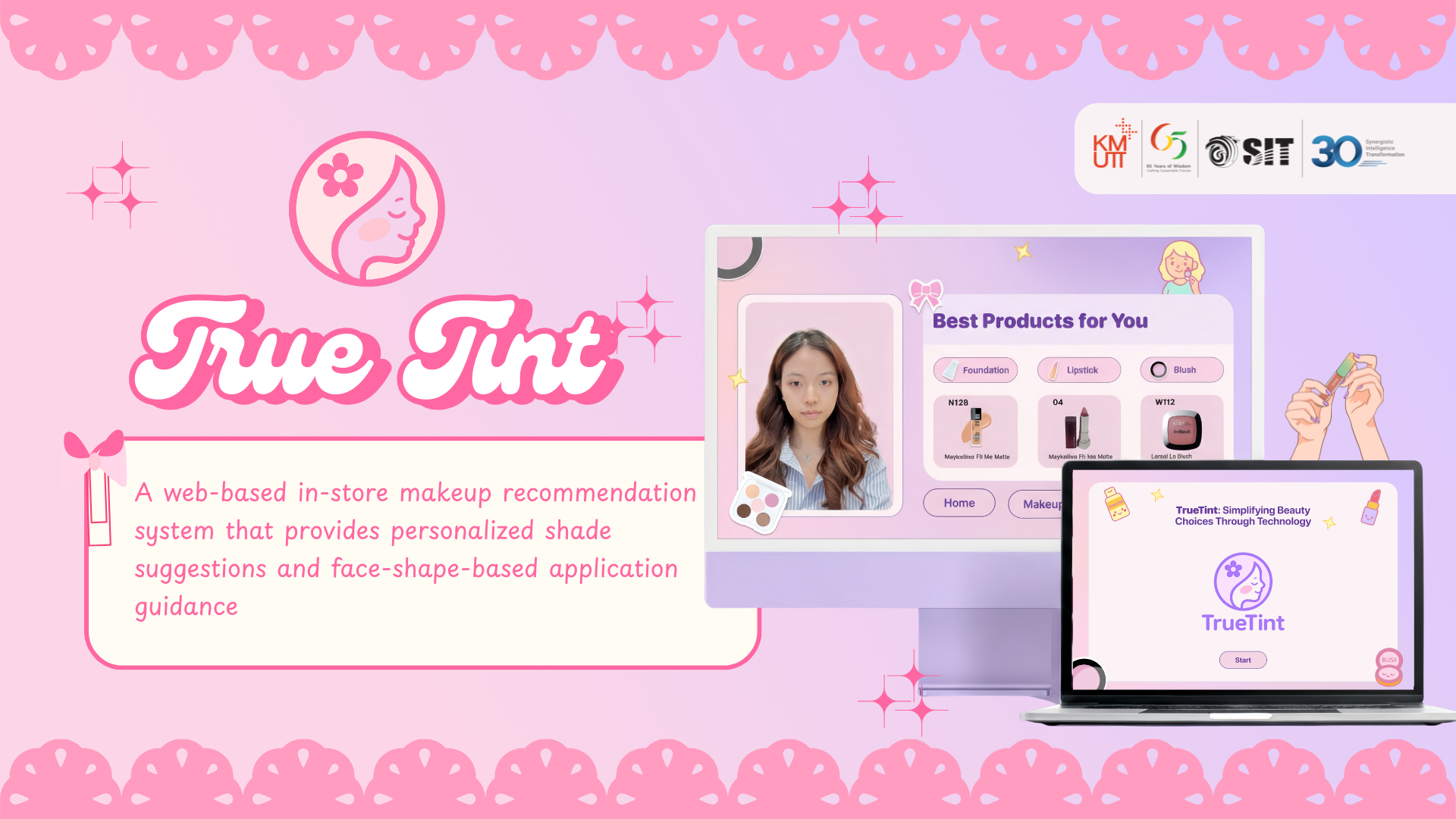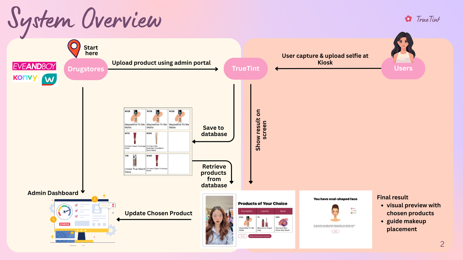 TrueTint is a web-based system that helps customers find the perfect foundation, blush, and lipstick shades based on their individual skin tone using a webcam. It provides real-time, personalized shade recommendations with a virtual try-on feature for an enhanced in-store experience. Additionally, TrueTint analyzes the user’s face shape to guide how to apply blush, contour, and highlighter correctly for balanced and flattering makeup results.