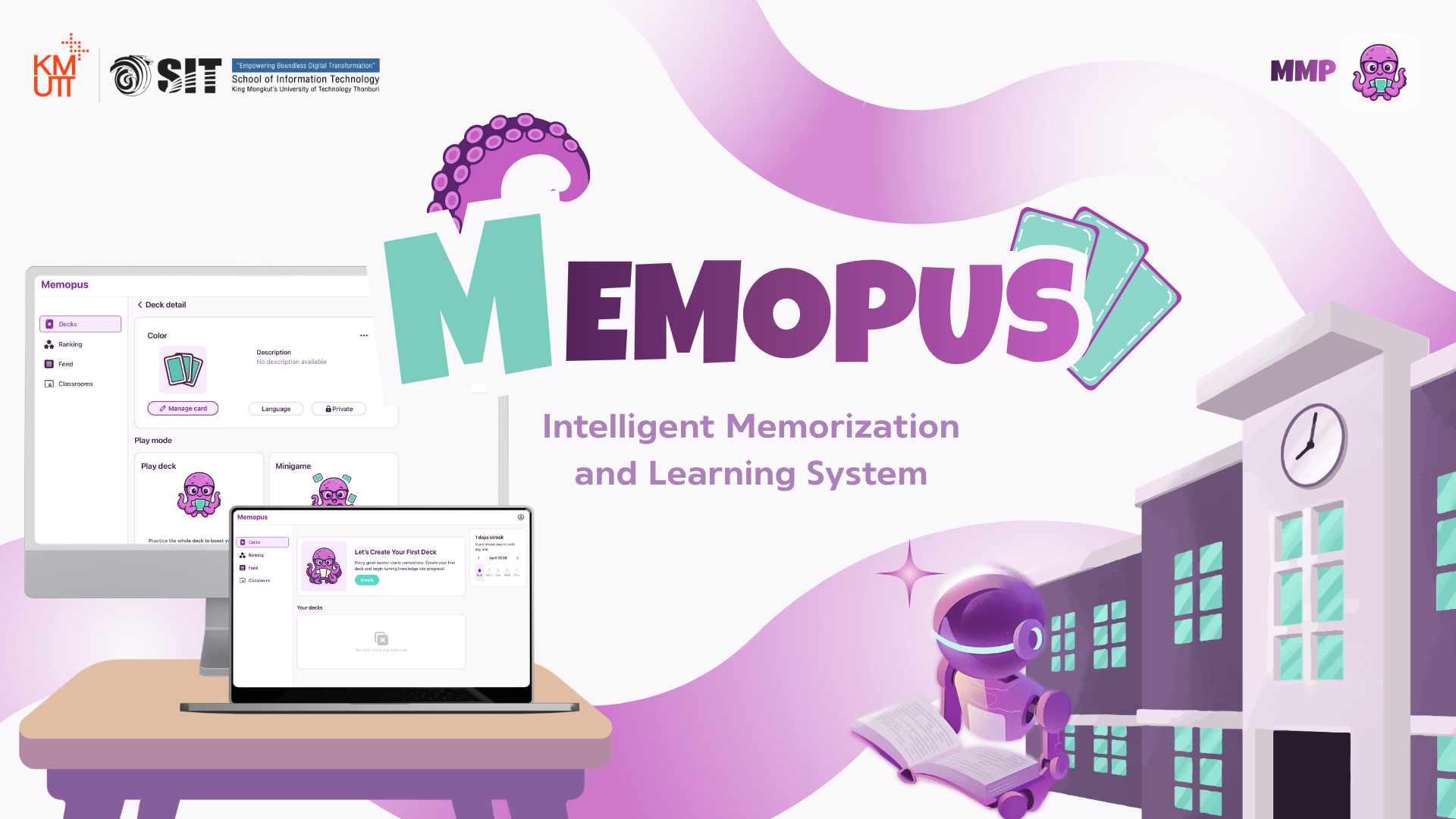 Memopus is an intelligent memorization and learning system designed to address modern learning challenges such as information overload, limited study time, and the lack of effective review tools. The system integrates key learning concepts including spaced repetition, active recall, and gamification to improve long-term memory retention and learner motivation. It is developed as a web application featuring flashcard creation, progress tracking, reminder notifications, daily goals, and AI-powered content summarization and flashcard generation. The results show that Memopus effectively supports learners in planning review schedules, enhances learning consistency, and promotes both self-directed and collaborative learning.