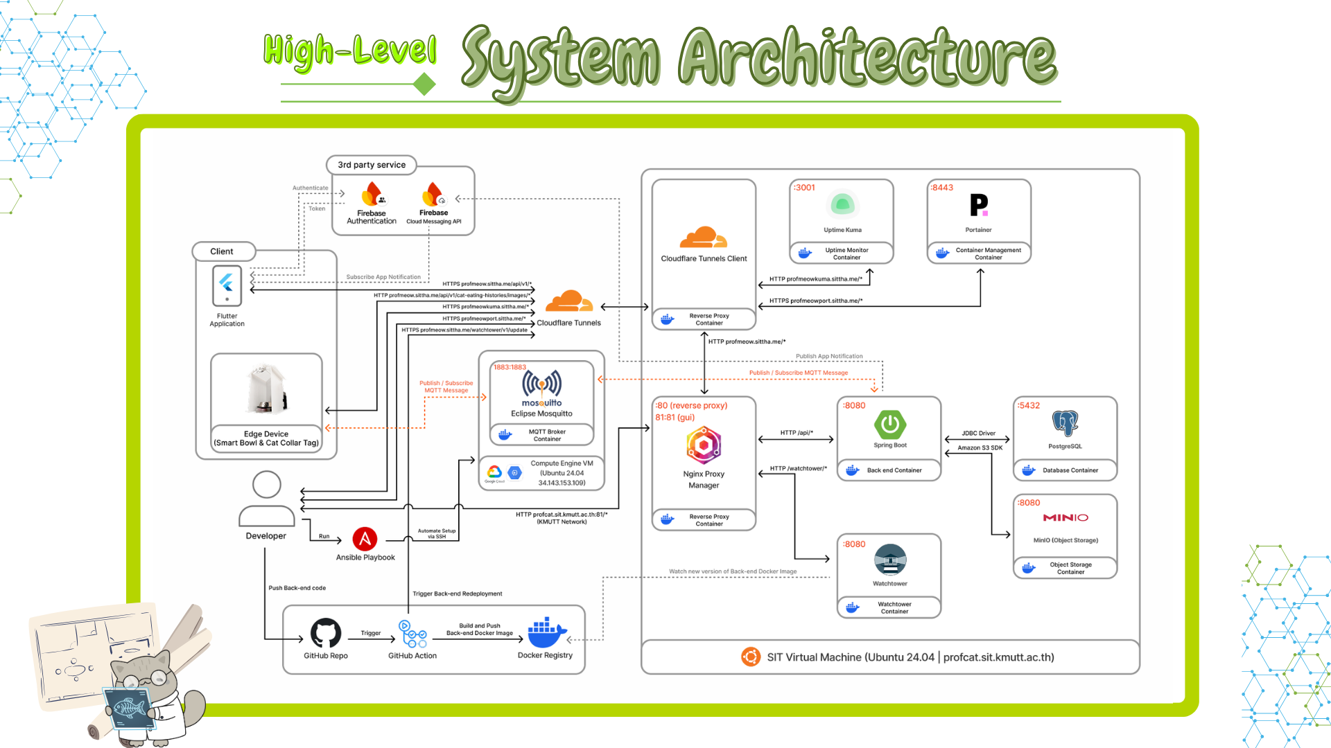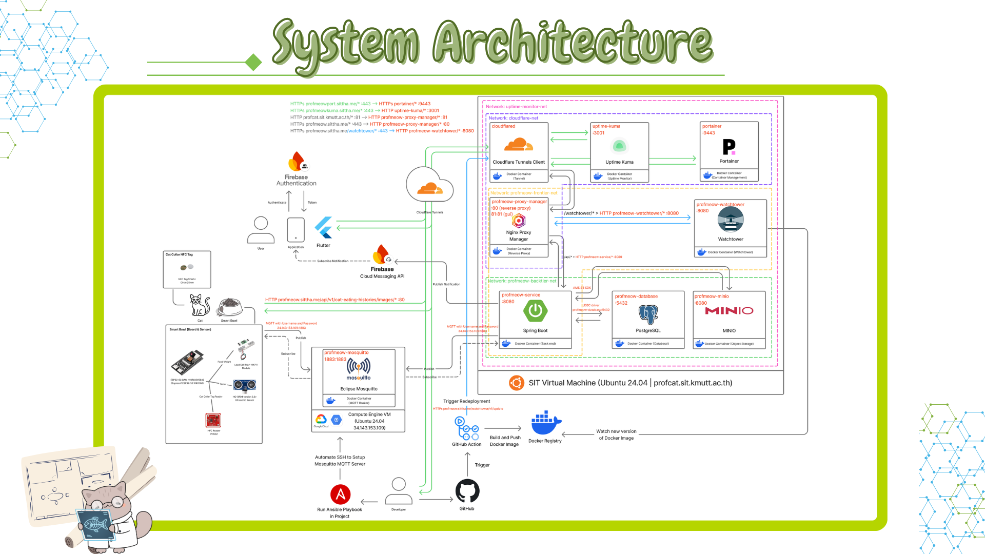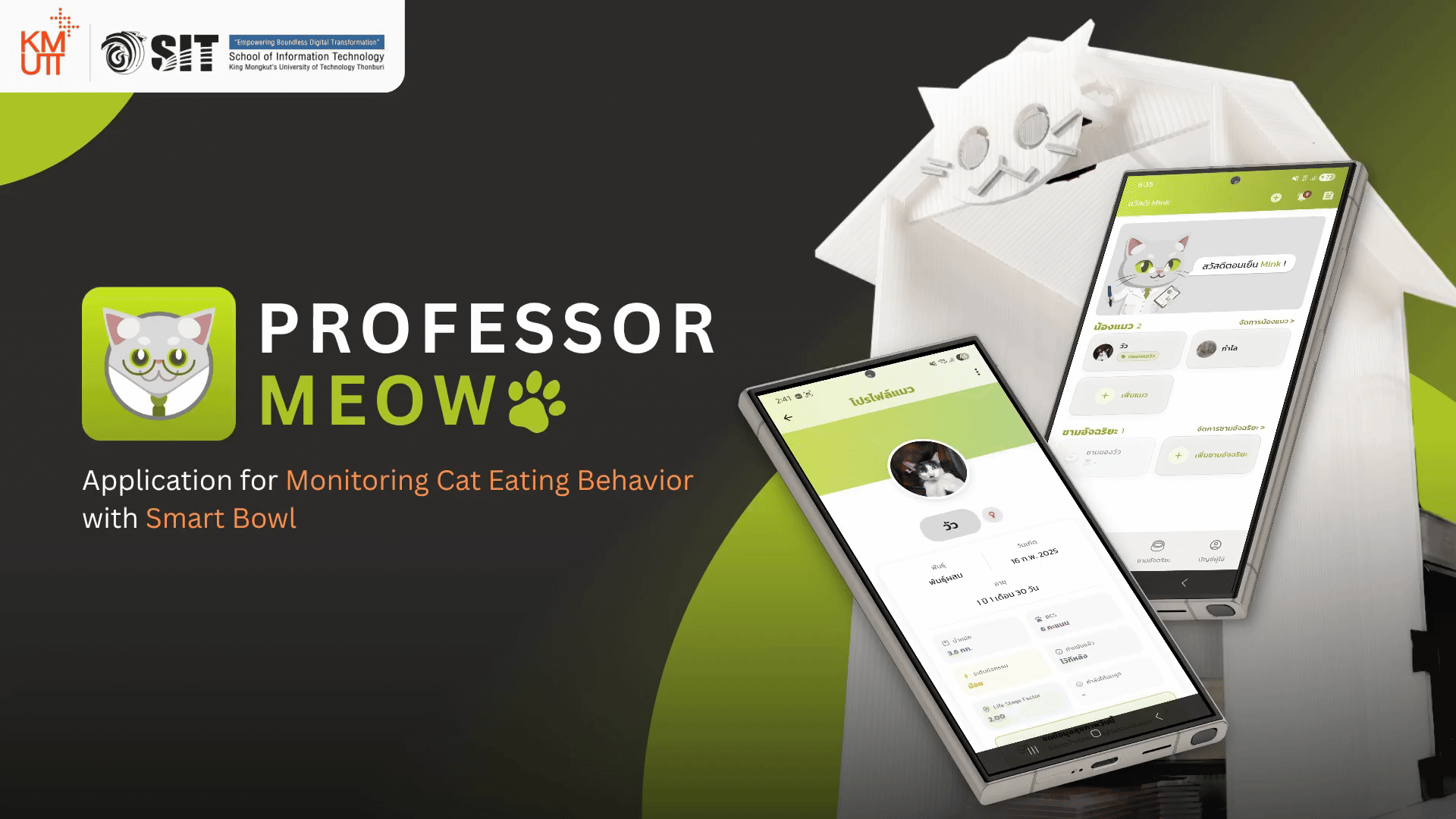 Professor Meow is an IoT-based application designed to monitor cats’ eating habits through a smart bowl. The system collects and analyzes data such as meal times, portion sizes, and feeding frequency of cats to help owners understand and manage their cats’ eating behavior more effectively. This systematic tracking helps identify abnormal eating patterns, which may serve as early indicators or signs of health issues such as obesity, malnutrition, or digestive problems.