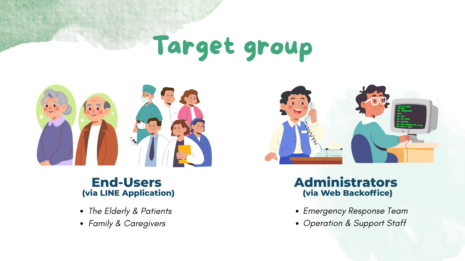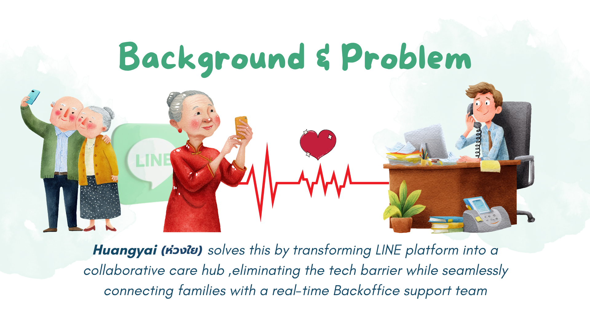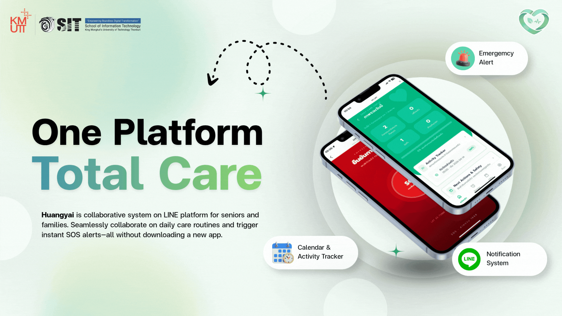 HUANGYAI is developed on the LINE platform to address challenges in collaborative elderly and patient care, where multiple caregivers often face issues such as miscommunication, missed appointments, and scattered information. The system provides a centralized solution for managing schedules, medication, and essential care data, allowing all members to access and update information in real time with role-based notifications to reduce errors. It also supports a backoffice system for administrators to manage data, control access permissions, and monitor system usage, ensuring security and operational efficiency.