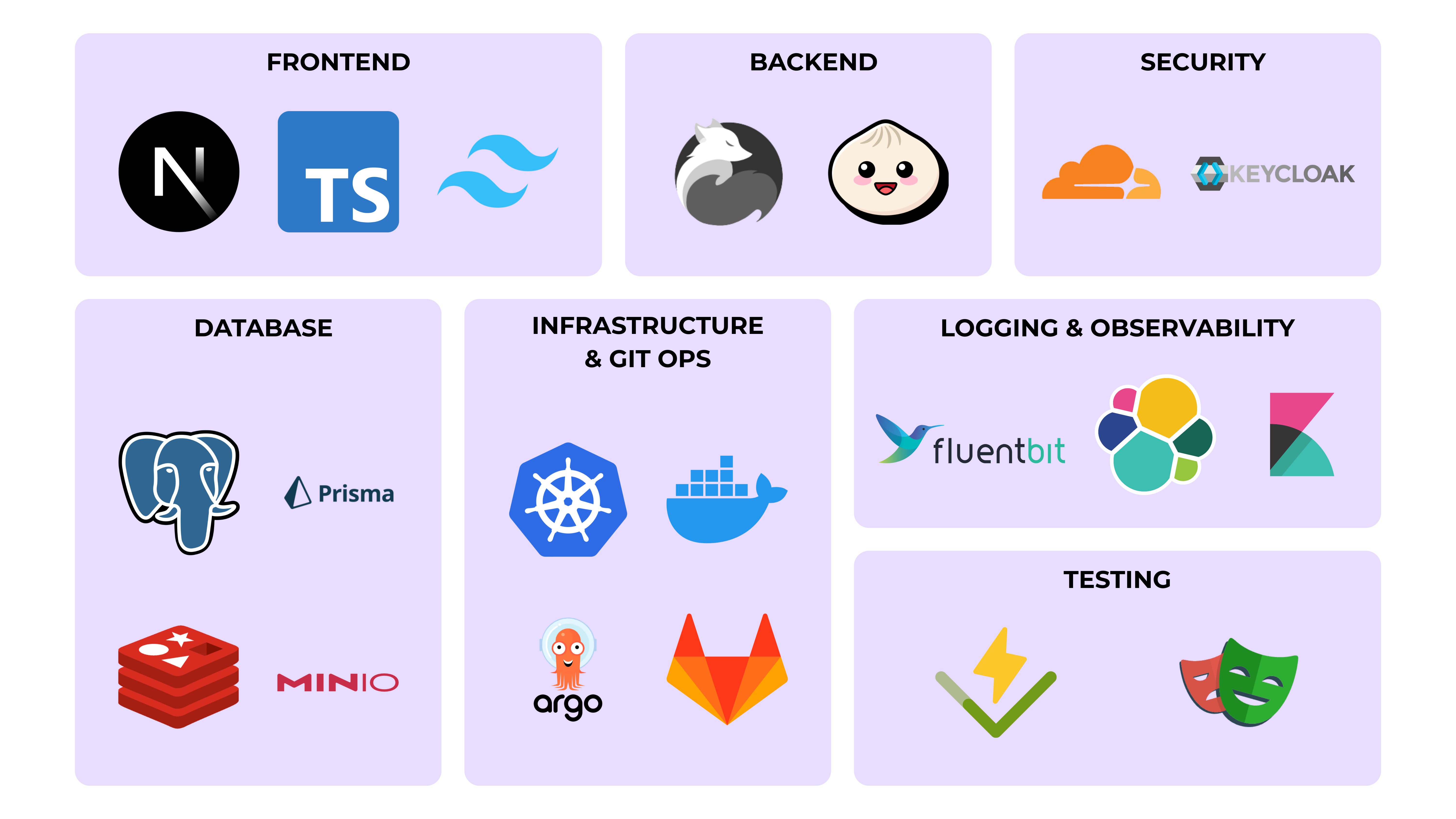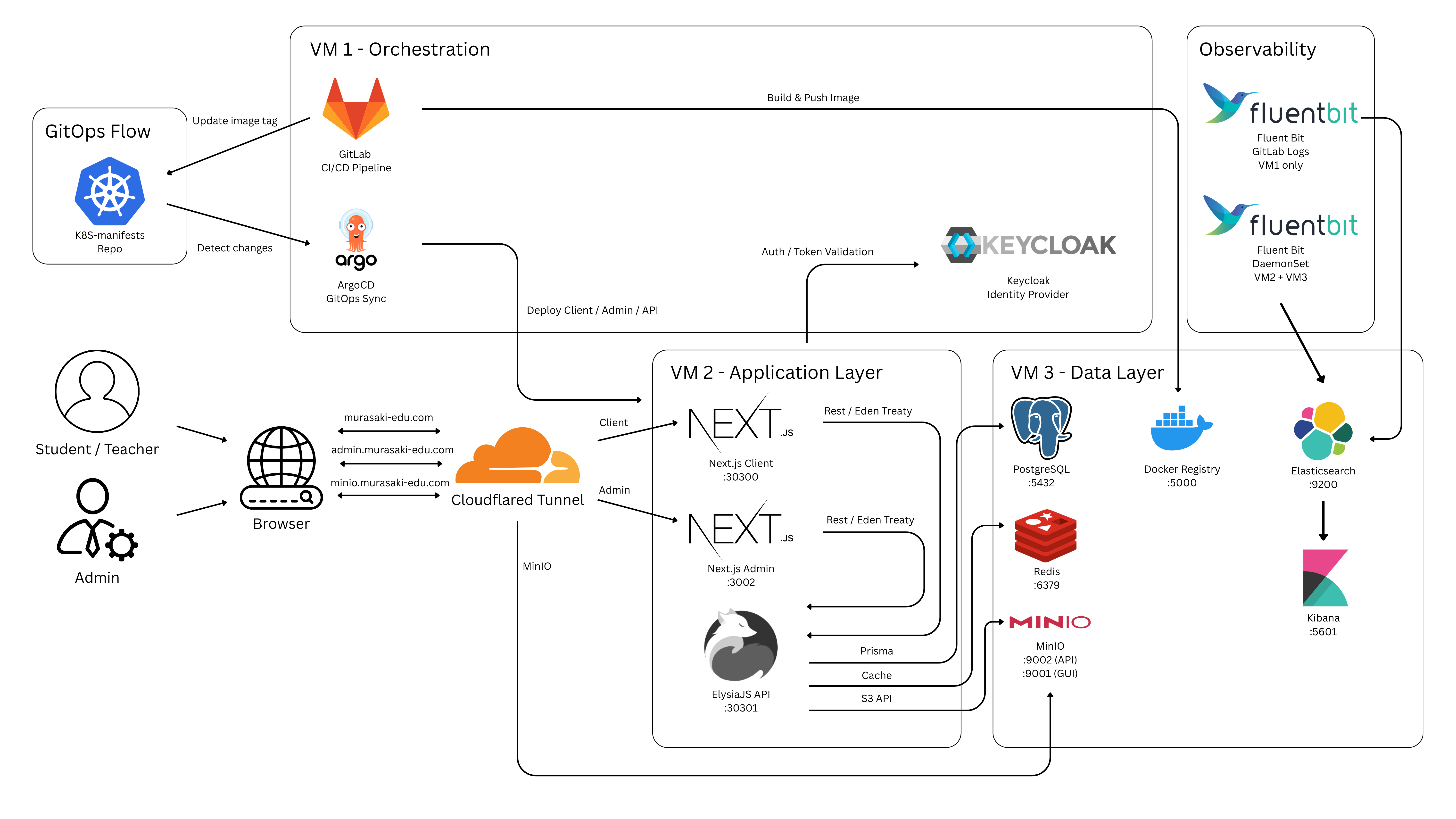 The frontend is built with Next.js 16, React 19, TypeScript, and Tailwind CSS v4. The backend runs on Elysia.js with Bun, backed by PostgreSQL via Prisma ORM, Redis, and MinIO. AI grading uses Google Gemini 2.5 Flash through the OpenRouter API. Infrastructure runs on k3s Kubernetes with ArgoCD for GitOps, GitLab CI/CD for automated deployments, and an ELK stack for observability