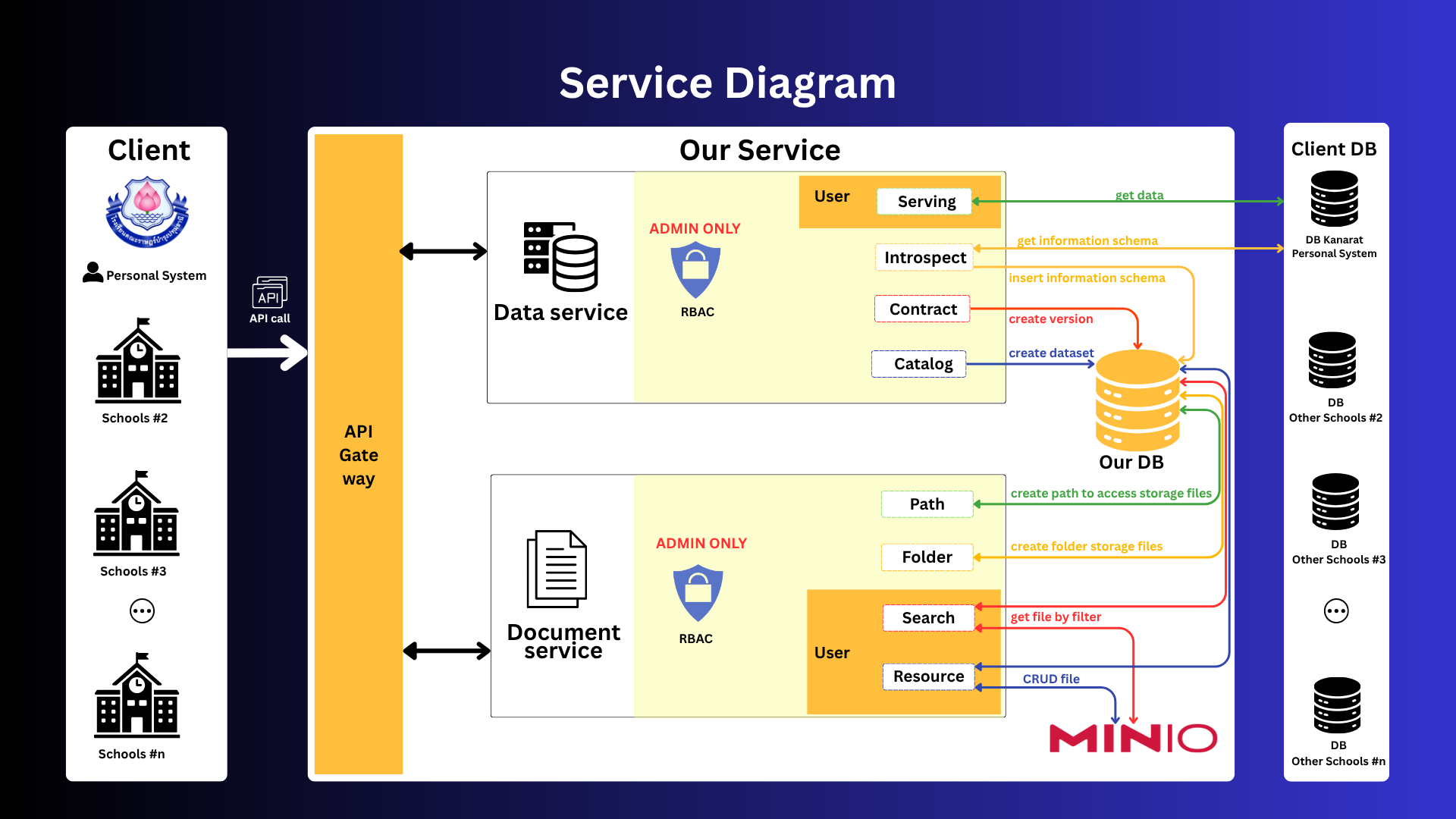 The School Management System (SMs) is designed as a common service platform that connects to an existing school database and provides standardized APIs for other systems to access data and documents. Instead of building direct database connections for each application, other services can simply integrate with SMS to retrieve and manage the information they need.