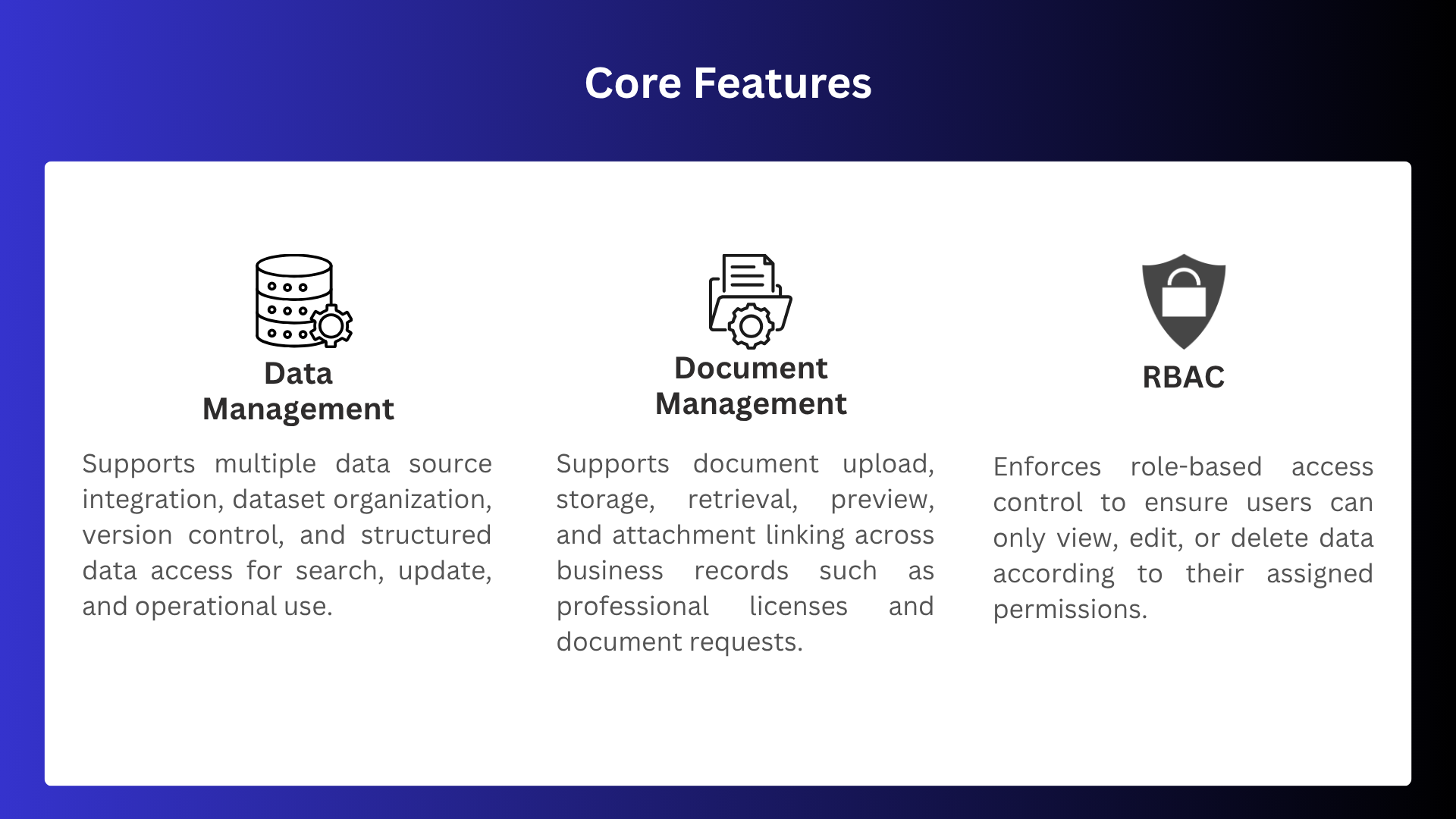 The platform consists of two main components: the Data Management Service and the Document Management Service. These core services support centralized data access, document handling, and system integration.